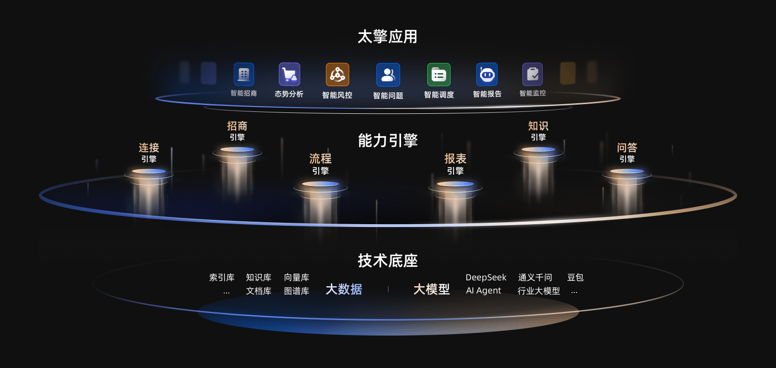 作为新一代 AI 技术能力平台,「太擎 1.0」致力于解决传统 IT 技术架构难以融合 AI 大模型的痛点,为企业提供连接引擎、问答引擎、报表引擎、流程引擎等丰富的 AI 技术能力引擎。通过搭建 “让 AI 能看懂、会操作” 的技术基建,「太擎 1.0」有效解决企业系统数据孤岛多、软件开发效率低的难题,加速企业数智化进程。