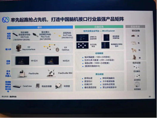 他展示的一张脑虎科技产品全家福显示,在硬件层面,脑虎科技已经做了能够插入狗、鼠、兔等动物身上的电机和植入体产品,同时也做了采集芯片、手术植入机器人、脑电图机等产品;在软件层面,脑虎科技也研发了软件和算法云平台—MindExplorer,以及猴类、犬类、啮齿等动物类数据,以及与之相关的各类算法模型。