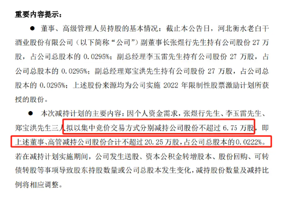 在业绩不振的环境下,老白干酒高管还曾计划减持股份,此举进一步打击了投资者信心。公告称,副董事长张煜行、副总经理李玉雷与郑宝洪拟以集中竞价方式减持公司股份合计不超过20.25万股,合计减持比例不超过公司总股本的0.0222%。虽然最后三人均未减持,不过,这一操作依然引发部分投资者不满,纷纷猜测这是否意味着公司高层对老白干酒未来发展信心不足。