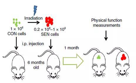具体来说,首先,为了确定衰老细胞是否会导致身体功能障碍,Kirkland博士团队给“年轻”(4个月大)小鼠注射了衰老细胞或者非衰老对照细胞。仅仅两周后,注射了衰老细胞的小鼠就出现了生理功能受损。此外,源自小鼠自身的衰老细胞数量也有所增加,表明衰老效应在邻近细胞间传播。