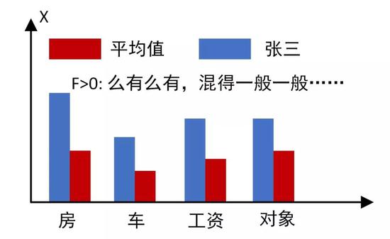 若Xi取值都高于周围同龄人平均值Xi*,则F返回值为正,此时,张三在返乡过年期间不但不会受到外界压力,反而会给其他人输出压力,此谓之人生赢家,如图2所示: