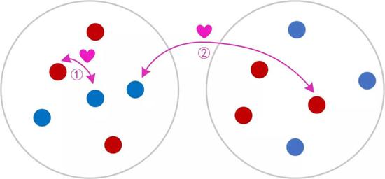图5 不同圈子男女婚恋结合示意图:路径①需要克服的逆熵较低,故而较为容易;路径②需要克服的逆熵较高,故而较为困难;