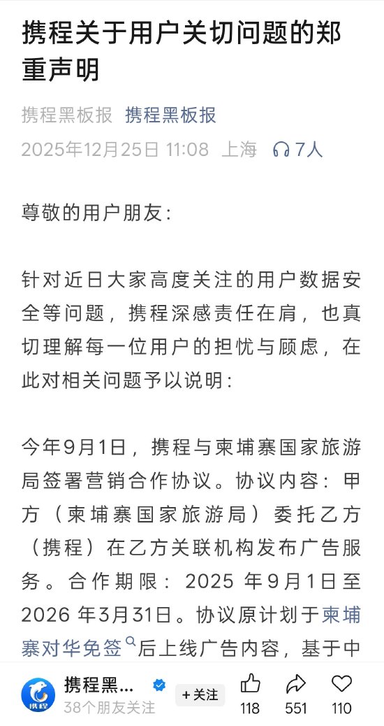携程表示,今年9月1日,携程与柬埔寨国家旅游局签署营销合作协议。协议内容:甲方(柬埔寨国家旅游局)委托乙方(携程)在乙方关联机构发布广告服务。合作期限:2025 年9月1日至2026 年3月31日。协议原计划于柬埔寨对华免签后上线广告内容,基于中国驻柬埔寨大使馆近期发布的安全提醒,我司第一时间暂停了原定的投放动作,合作未曾启动。携程承诺:该协议不涉及任何数据合作,绝不存在泄露用户隐私信息的情况,并已将合作协议及实际情况提交相关部门验证核查。