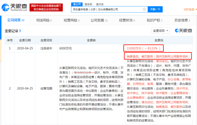 新浪科技讯 5月5日上午消息,天眼查数据显示,近日,京东星宇电竞(北京)文化传播有限公司注册资本发生变更,由6000万元增加至11000万元。