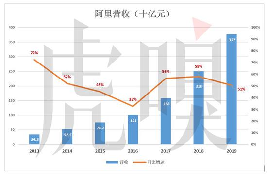 2019财年,阿里营收3768亿元,同比增长51%。