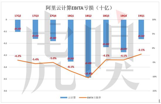 2018年Q3起,云计算亏损迅速收窄。2018年Q4,EBITA亏损2.7亿,亏损率4.1%;2019年Q1,EBITA亏损1个亿,亏损率仅为2.1%,而且营收增速超过77%,非常亮眼。
