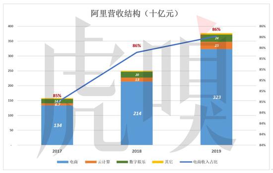 尽管多元化取得进展,但由于电商业务增长太强劲,导致最近三年电商营收占比不降反升。2019财年,核心电商业务收入占总营收的85.8%,比2017年高1.2个百分点。