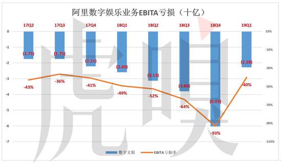 阿里数字娱乐业务主要包括优酷土豆和UC浏览器。2019财年Q1息税摊销前亏损22.8亿,亏损率收窄至40%。但营收同比增速仅为7.6%,远远落后于“大盘”。