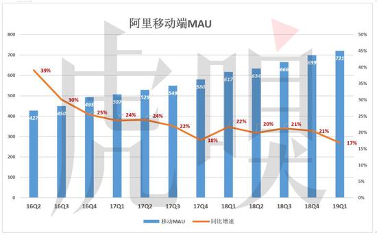 阿里对“移动MAU”的定义是“当月访问阿里旗下APP的移动设备台数”——财报披露的季度数据为本季三个月的均值——2019年Q1,阿里移动MAU季度均值为7.21亿,净增1.04亿,但增幅降至17%。