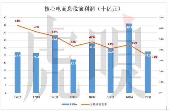 2019年Q1,核心电商板块息税及摊销前利润(EBITA)达275亿,同比增长24%,低于营收增速,原因是利润率跌了9个百分点。