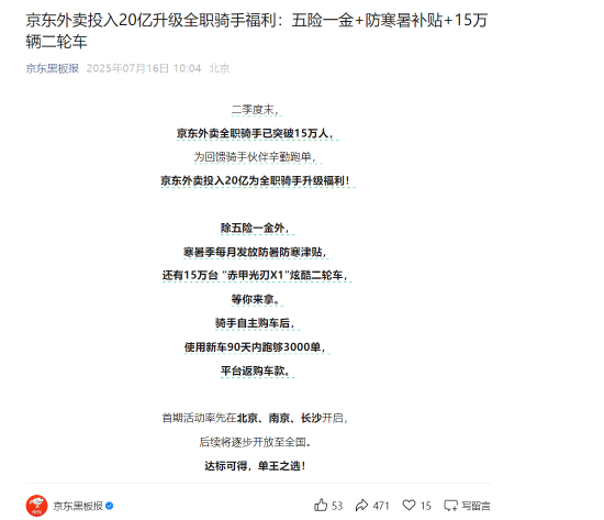 京东外卖:全职骑手突破15万,将投入20亿升级福利