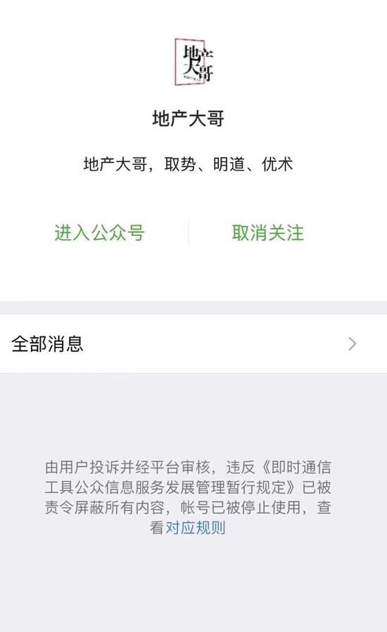 今天上午经蓝鲸记者查询发现,“地产大哥”已被封号。