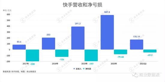 不过,据快手2021年Q1财报披露,快手国内主站日活用户为 2.95 亿,比去年同期增加了 4000 万,增长遭遇瓶颈。而另一方面,快手在商业化进展方面要好于用户增长,2017年到2020年营业收入高速增长的同时,净亏损在不断收窄。不过2021年Q1的净亏损却突然扩大,导致其财报发布后,市值蒸发1000亿港币。