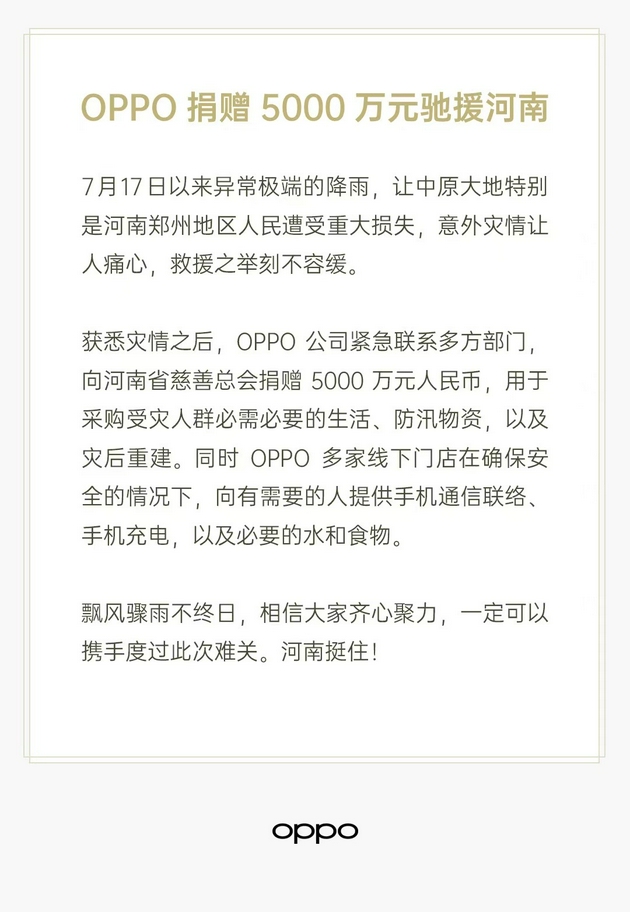 新浪科技讯 7月21日午间消息,OPPO公司宣布向河南省慈善总会捐赠5000万元人民币,用于采购受灾人群必需必要的生活、防汛物资,以及灾后重建。