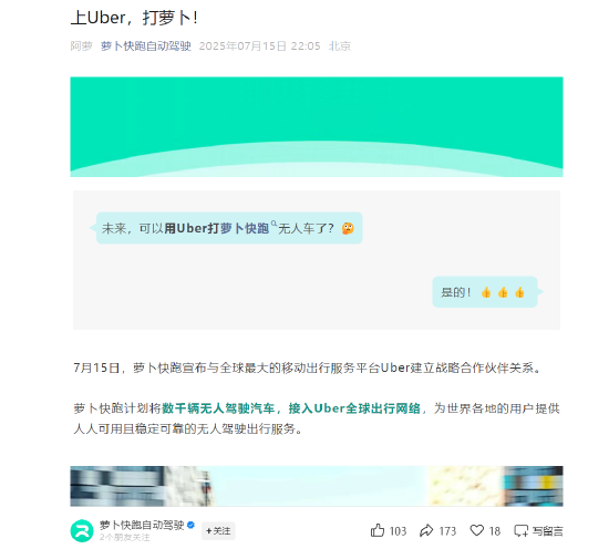 萝卜快跑与Uber达成战略合作,年底前在亚洲和中东部署第六代无人驾驶汽车