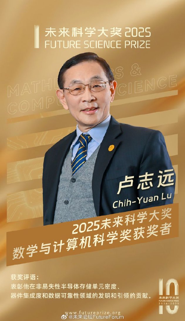 2025未来科学大奖数学与计算机科学奖获奖者:卢志远。获奖理由:表彰他在非易失性半导体存储单元密度、器件集成度和可靠性领域的发明和引领的贡献。