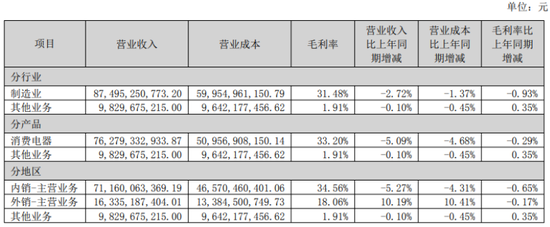 从2024年年报开始,格力电器调整统计口径,主要将原“空调”与“生活电器”两大板块合并为“消费电器”。2025年上半年,格力电器消费电器实现营收762.79亿元,同比减少5%,总营收占比仍旧高达78.38%。