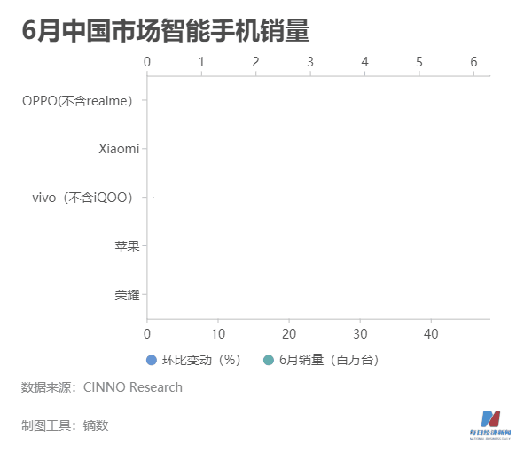 具体到6月份,也出现了新的变量。独立后的荣耀首次进入国内市场前五,当月销售量240万台,同比下滑43.1%,华为跌出前五列入“其他”。获得高通等供应链的支持后,荣耀从6月份开始,频繁发布新品,加上“618”电商大促销,市场份额反弹明显。当月vivo和苹果均出现了下滑的局面,苹果同比和环比均下滑严重,其中同比减少近四分之一的份额。