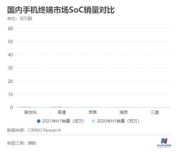 CINNO Research数据显示,上半年苹果芯片同样保持了高增长,终端市场销售2260万颗,增长32.3%。华为海思方面下降六成,为2140万颗。三星方面取得了不错的成绩,在华销售480万颗,同比增长36.7%。