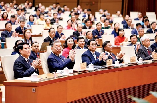 5月5日,越南河内,(左起)越南国家主席梁强、越共中央总书记苏林、越南总理范明政出席越南第十五届国会第九次会议。图/视觉中国(19.580, -0.21, -1.06%)
