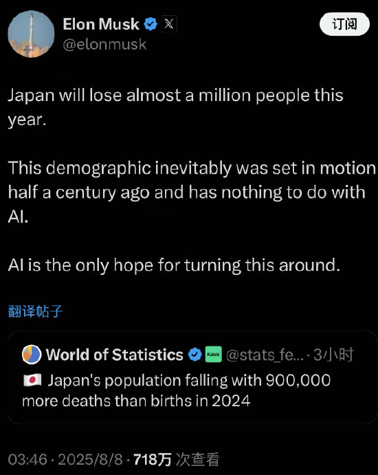 马斯克:日本今年将减少近100万人口,人工智能是扭转局面的唯一希望