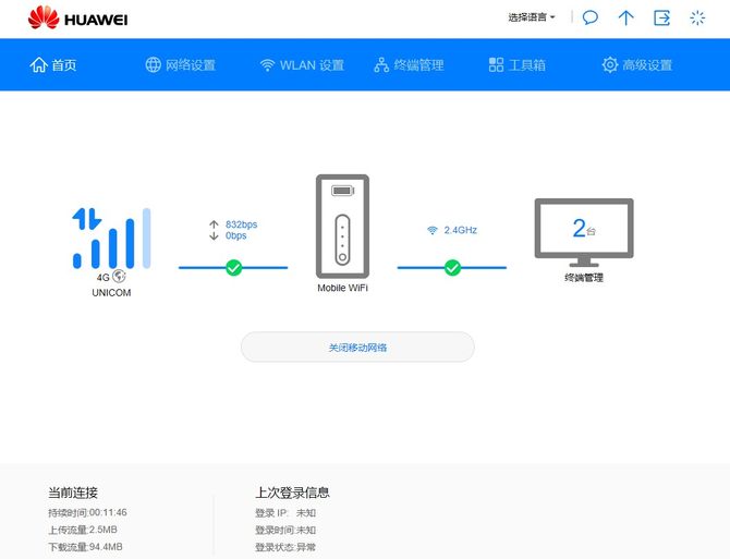 华为随行WiFi 2 畅享版可以分别在手机端和PC端进行设置,只需要打开浏览器输入192.168.8.1,输入账户密码即可进入,为了展示的更清晰,我们这里使用PC端设置的截图。