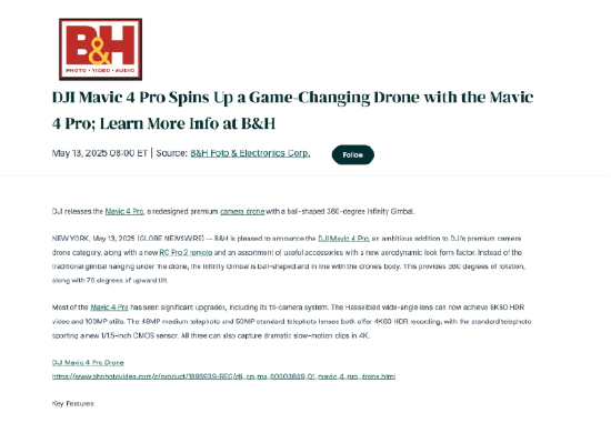 耐人寻味的是,这或许是大疆上个月才临时改变主意。因为据美国媒体报道,在正式发售之前,B&H和Adorama等美国消费电子零售商有了小数量备货。B&H甚至还发布了Mavic 4 Pro上市的新闻稿。