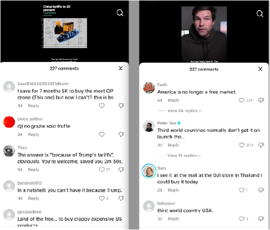 这一消息无疑让美国的无人机发烧用户感到失望:他们无缘第一时间用上Mavic 4 Pro。一位美国网友在TikTok上留言写道,自己已经存了七个月的钱,准备了五千美元买顶配版,现在却只有失望。