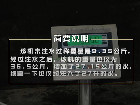 该机未注水过称重量是9.35公斤,比同容量的产品要轻很多,这也让我们对其真实容量有所怀疑。果然,经过注水之后,该机的重量也仅为36.5公斤,也就是说增加了27.15公斤的水,换算一下也仅约注入了27升的水,和标称50升相去甚远,虚标极其严重。