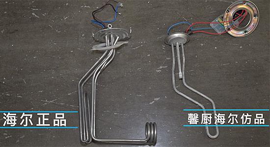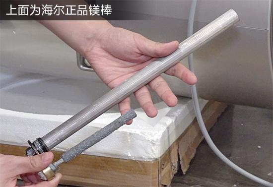 随着拆机的深入,出现了更让人睁目结舌的事。众所周知,为了避免加热水腐蚀内胆,电热水器内都安装有镁棒,这就是拼购热水器的镁棒,短小、粗糙,像是用过很久的。如果您对这个镁棒没什么概念,和海尔正品镁棒对比之后,您一定会大吃一惊,不论是长度还是粗细都差别巨大。