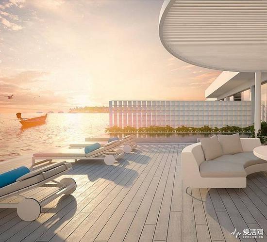 当顾客预订了这家酒店后,他将会得到整栋别墅,包括海面上和海底部分。在海面上,房间里用一整块全景玻璃代替了墙面,正对着日落的位置,单面玻璃设计,在外面是看不到卧室里面的。在海上落日的余晖下,露台的海景非常美,适合开派对或者举办小型仪式。