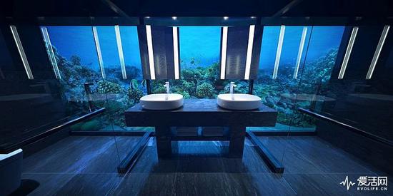 不过重点当然是海底部分,包括一个与海底相连的生活区、浴室及顶级配置的卧室。顾客将睡在一个玻璃圆顶状的房间里,周围则被大海和任何碰巧路过的海地生物包围,同样是单面玻璃的设计,外面看不到内部情况,洗手间对面就是五光十色的珊瑚。