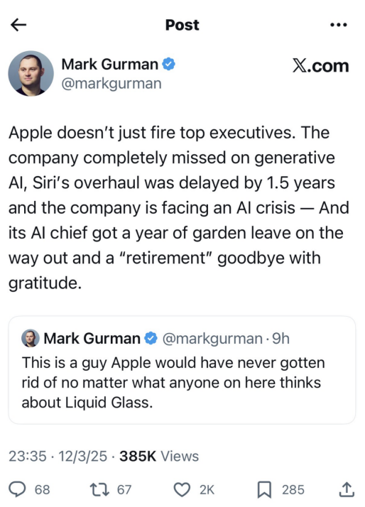 正如彭博社记者古尔曼(Mark Gurman)指出的,“(库克时代的)苹果通常不会直接开除核心高管。苹果完全错失了生成式AI时代,Siri的重组推迟了整整一年半时间,整个公司都处在AI危机之中。但苹果还是给了AI负责人一年的隔离期(garden leave,即在离职前剥夺职权,有薪水但不用工作)以及一个体面的退休告别。”