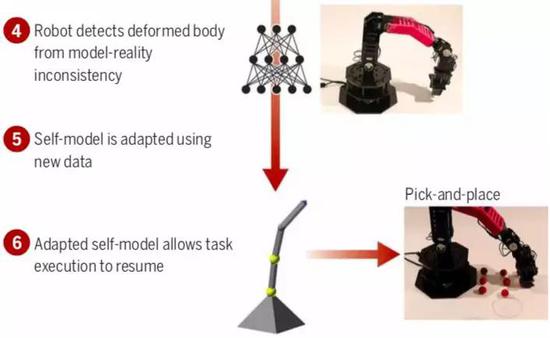 在经过35个小时的“初步学习”之后,机器人创建了一套自我模拟。然后利用自模拟器来考虑和适应不同的情况,处理新任务,甚至能检测并修复机体损伤,继续处理任务。