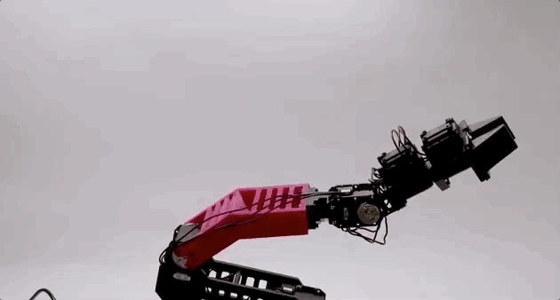 研究人员利用3D打印打造了一个变形的部件(下图红色部件)来模拟机体损伤,结果机器人能够检测到这一变化,并重新训练自我模型。新模型能够以很少的性能损失为代价,重新成功执行拾取和放置任务。