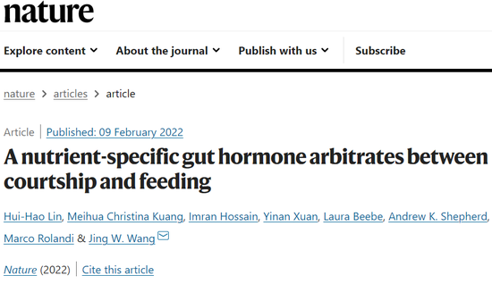 [1] Lin, HH。, Kuang, M.C。, Hossain, I。 et al。 A nutrient-specific gut hormone arbitrates between courtship and feeding。 Nature (2022)。 https://doi.org/10.1038/s41586-022-04408-7
