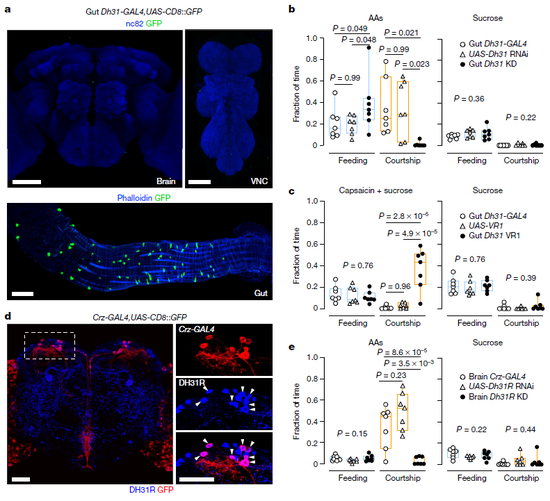 究竟是什么信号分子在操控这个行为切换的开关?已有的研究发现,在哺乳动物中,胃肠道的内分泌细胞释放的一些饱腹激素能促进生殖行为,研究团队因此从果蝇的内分泌细胞中着手寻找线索。他们发现,果蝇在摄入氨基酸后,肠道内分泌细胞会释放Dh31。