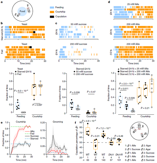 研究团队发现,饥饿的雄性果蝇在面对食物与雌性果蝇时,会选择优先进食。进食氨基酸或高蛋白食物的果蝇远比进食蔗糖的果蝇要更快速、更强烈地开始求偶行为,这个行为的转换往往发生在短短几分钟之内。这一结果说明,氨基酸通过某种途径迅速激活了与求偶行为相关的神经通路。