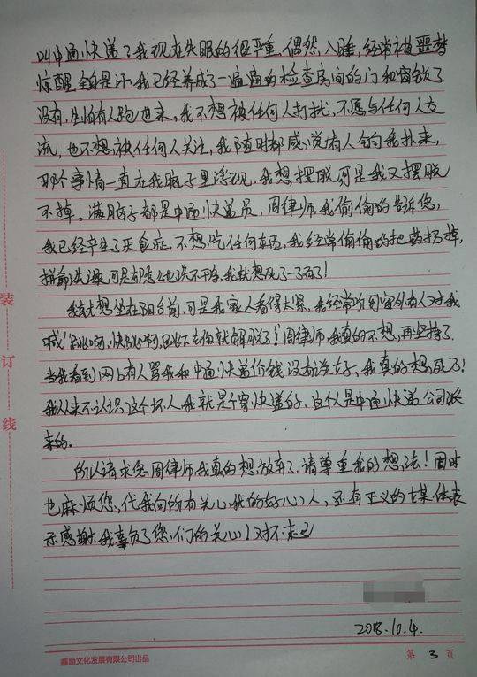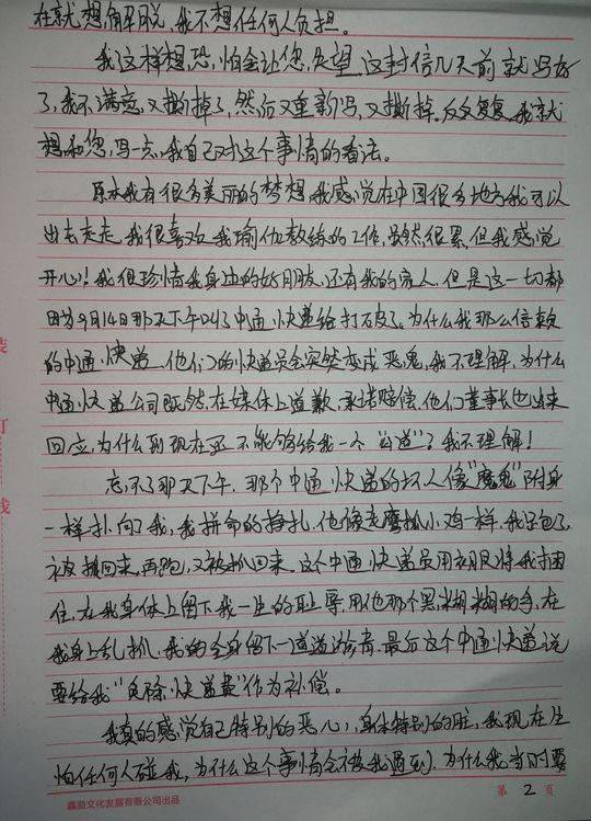 原本我有很多美丽的梦想,我感觉在中国很多地方我可以出去走走。我很喜欢我瑜伽教练的工作,虽然很累,但我感觉开心 ! 我很珍惜身边的好朋友,还有我的家人,但这一切都因为 9 月 14 日那天下午叫了中通快递给打破了。为什么我那么信赖的中通快递,他们的快递员会突然变成恶鬼,我不理解,为什么中通快递公司既然在媒体上道歉,承诺赔偿,他们的董事长也出来回应,为什么到现在还不能够给我一个 " 公道 "? 我不理解 !