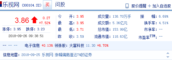 新浪科技讯 9月26日上午消息,继25日涨停后,乐视网(300104.SZ)今天(9月26日)打开涨停板,现涨7.52%,报3.86元。按开盘价计算,市值为153.99亿元。成交量138.70万手,涉资5.36亿元。
