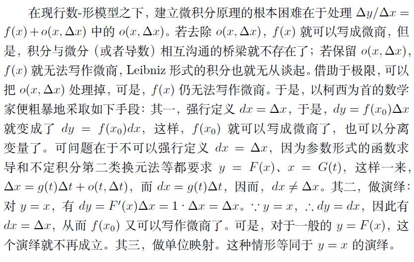 以上是扼要说明,丁小平先生在《浅谈现行微积分原理的错误》(《前沿科学》2015(4))一文中有详细的论述。