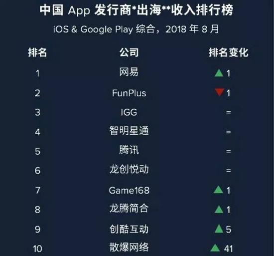 这样的隐患在今年开始凸显,网易开始取代这三家成为出海的第一,而在8月的榜单上,腾讯也已经跃升至了第5位。在仅仅4个月前的2018年4月,网易是第3,腾讯是第10。