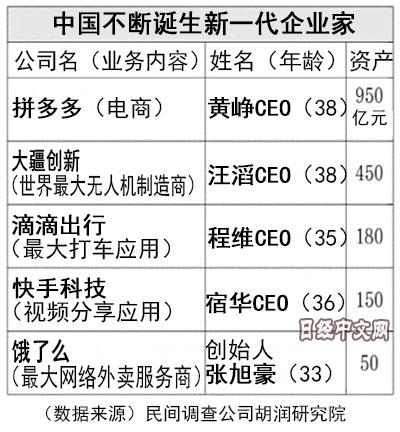 今年7月在美国纳斯达克市场上市的拼多多的CEO黄峥的资产额达到950亿元。世界最大无人机制造商“大疆创新(DJI)”的汪滔作为初创企业的经营者,资产额也达到450亿元,而滴滴出行的程维的资产达到180亿元。他们都是在30多岁便取得成功,掌握了巨大财富。
