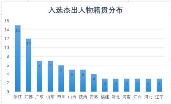 被表彰者中,浙江籍人士15人,江苏籍12人,广东籍和山东籍分别只有7人。浙江省委推荐的浙江杰出人物,清一色是土生土长的浙江人。而广东省委推荐的广东杰出人物,只有一半是广东人。