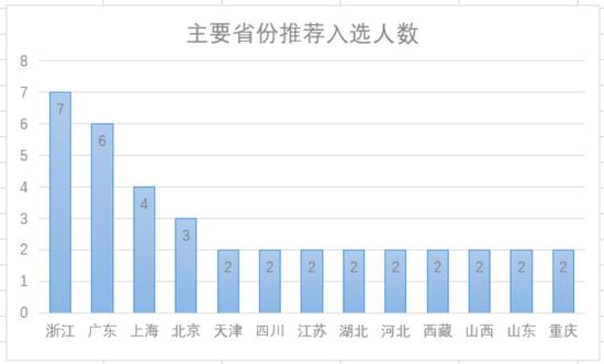 除了上述13个省、市、区外,其他18个省、市、区每个只分得一个名额,只有浙江、广东、上海和北京获得3个及以上的名额,浙江亦超过广东。
