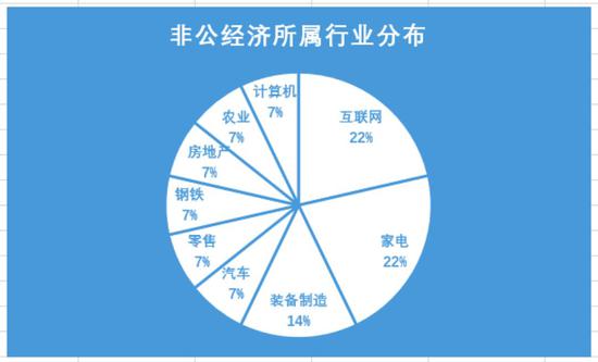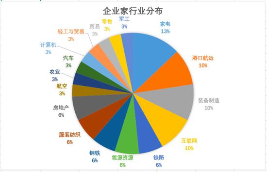 如将国有企业管理者、港澳企业家统计在内,所有企业界人士的行业分布如上。港口航运、钢铁、能源资源、铁路等,是国企较集中的领域,而民企具优势的则集中在家电和互联网。