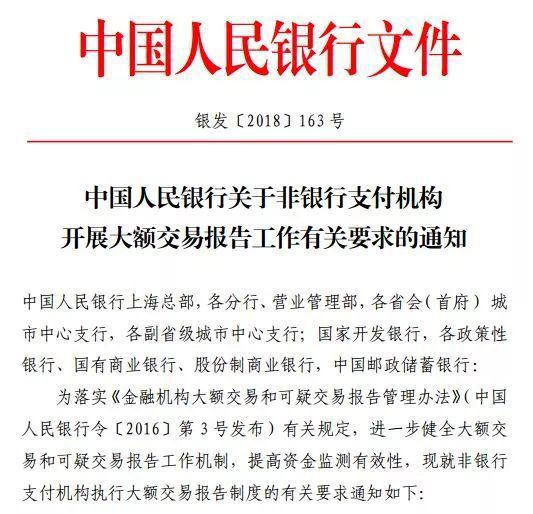 今年6月份,央行发布了《中国人民银行关于非银行支付机构开展大额交易报告工作有关要求的通知》(银发〔2018〕163号)。根据该通知要求,2019年1月1日起,包括微信支付,支付宝等在内的非银行第三方支付机构以下交易情况必须上报: