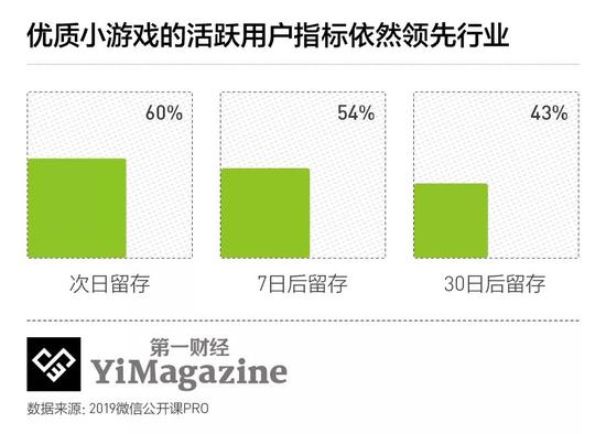 目前,微信小游戏的月度活跃用户已经超过4亿,相当于传统手游行业的用户体量;用户性别比例罕见实现1:1的打平,且在年龄层次上有“高龄化”的发展趋势。虽然大部分人都不再痴迷于“跳一跳”,但相比于许多手机游戏,优质小游戏的留存率依然更高。