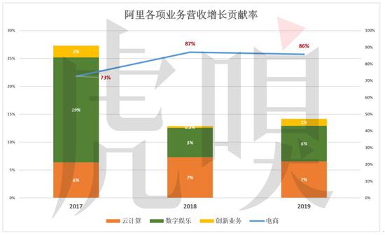 最近三年,电商对营收增长的贡献率从73%提高到86%;云计算业务的贡献率在6%~7%之间;数字娱乐贡献率一度高达19%,2019财年回落到6%,比云计算低一个百分点。