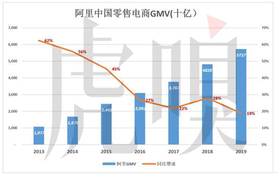 2019财年,阿里在中国的零售电商业务GMV达5.73万亿。这个数字相当于2018年中国GDP的6.4%、相当于2018年全国社会商品零售总额的15.7%(由于阿里的2019财年有三个季度在2018年、一个季度在2019年,不妨参照一下2018年的统计数据)。